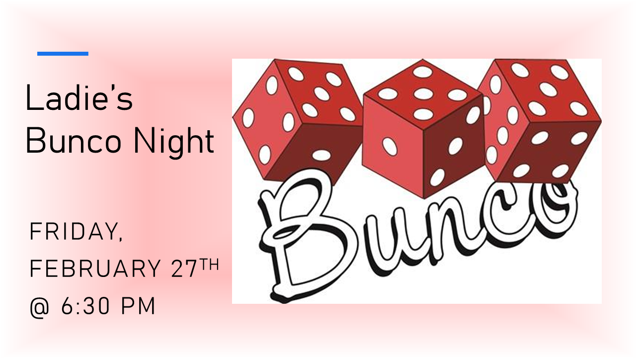 Ladies, Join us for a fun evening at the church in the fellowship hall for Ladies Bunco Night (fast paced social game where you move around different tables) on Friday February 27th at 6:30pm. Please bring a snack to share. We know that inclement weather could be a possibility, so please watch for an email on February 27th for more information.