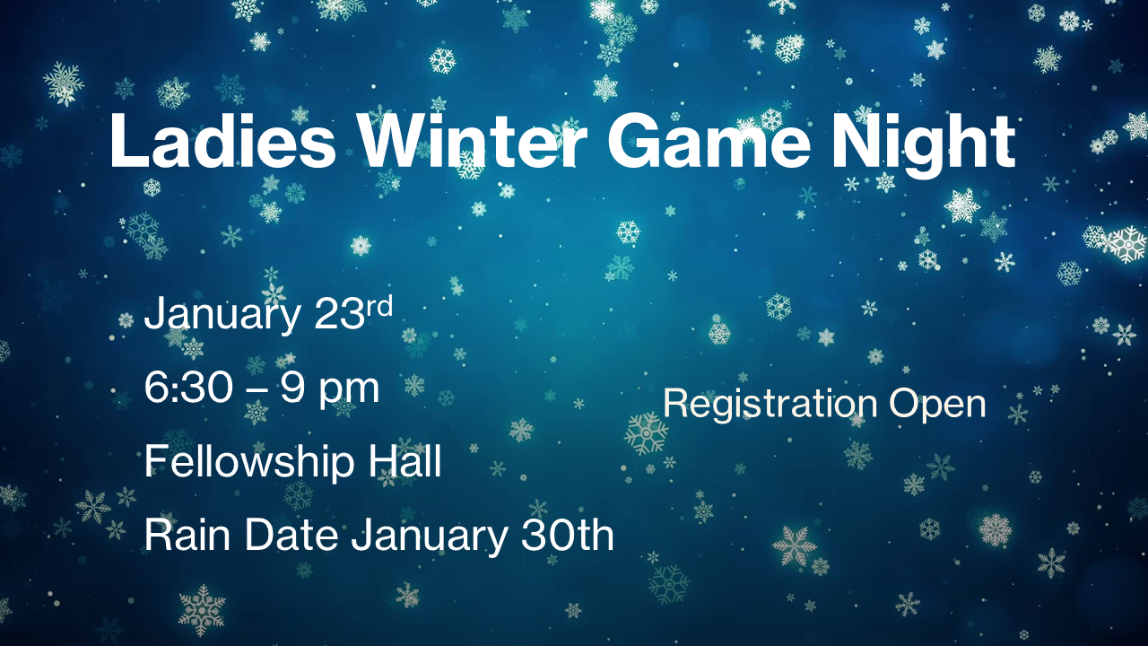 Ladies, Join us for a fun evening at the church in the fellowship hall for our annual women's game night (18 or older) on January 23rd at 6:30pm. Please bring a snack to share and your favorite game. Feel free to wear comfy, warm clothes! There is a snow date of January 30th. We know that inclement weather could be a possibility, so please watch for an email on January 23rd for more information.